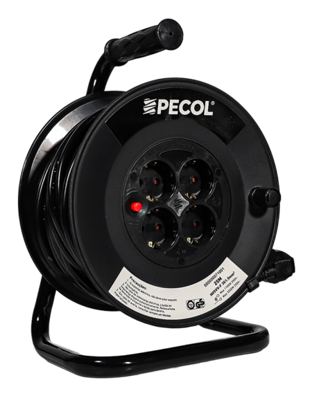 A extensão elétrica é composta por uma bobine em plástico semi-rígido, com uma pega e uma base de apoio.