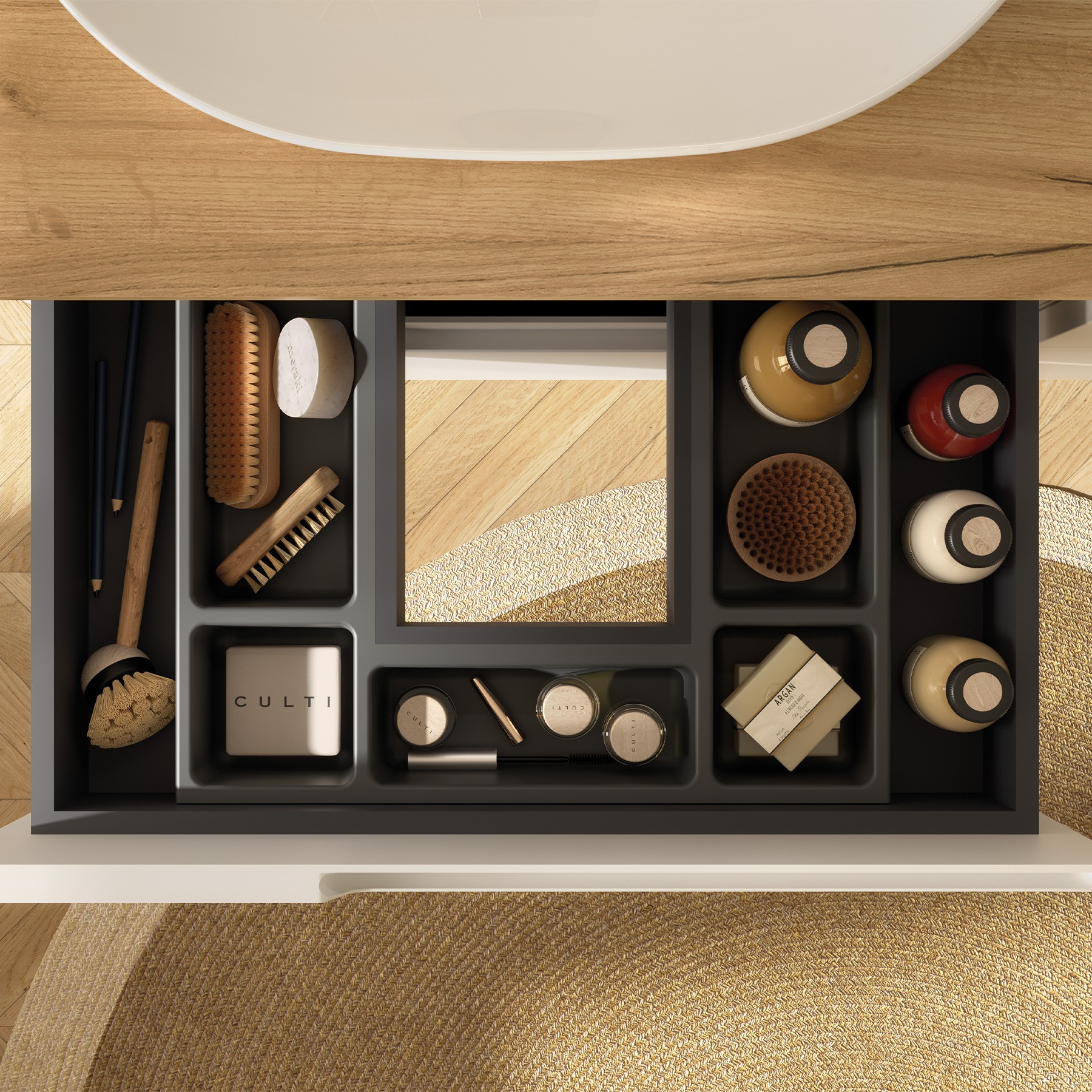 Graças à tecnologia 3D, a alça deste móvel fica completamente i,ntegrada na frente, criando um estilo prático e elegante.
